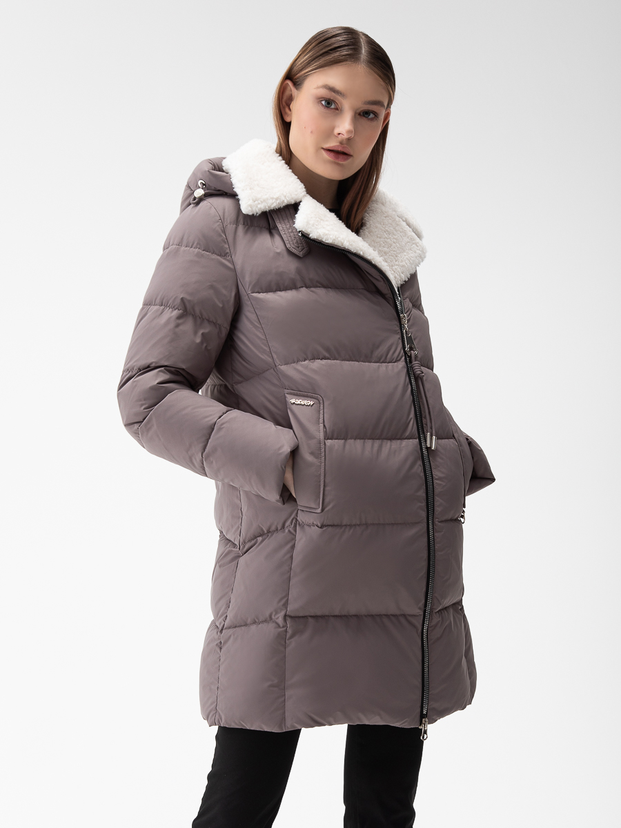 Крой воротника - съёмный капюшон, отделка эко мех