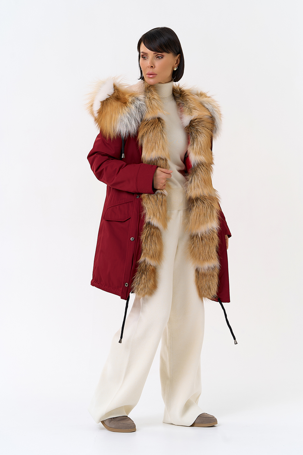 Крой воротника - капюшон, отделка лиса рыжая, овчина