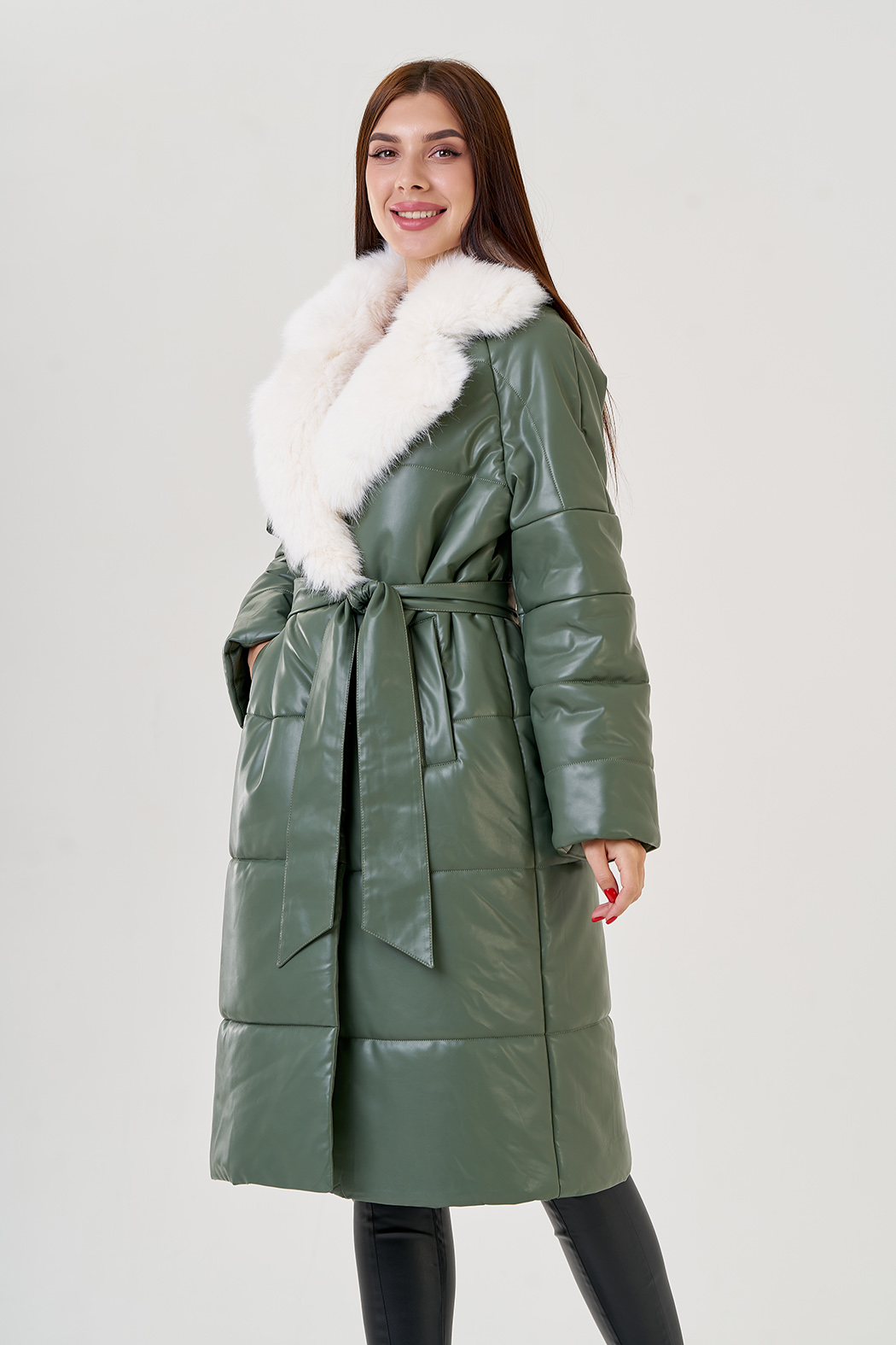 Пуховик в зеленом цвете с воротником из эко меха. Модель выполнена из эко кожи, что позволяет ей быть прочной и эластичной. Меховой воротник отстегивается. Английский ворот подчеркнет вашу шею. По бокам имеются прорезные карманы. В комплекте идет пояс из материала верха.